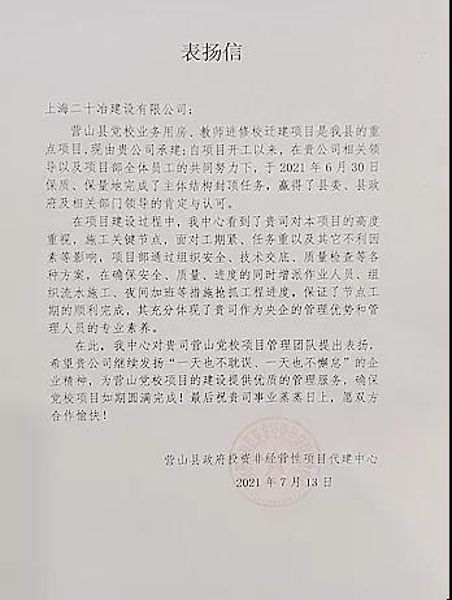 On July 15, the Relocation Project of Yingshan Party School Business Room and Teacher Training School undertaken by Shanghai MCC20 received a letter of praise from the Owner, the construction center of non-operating projects invested by the yingshan county government. The Owner highly praised the meticulous organization and scientific management of the project management team of Yingshan Party School of Shanghai MCC20 in the process of project construction.