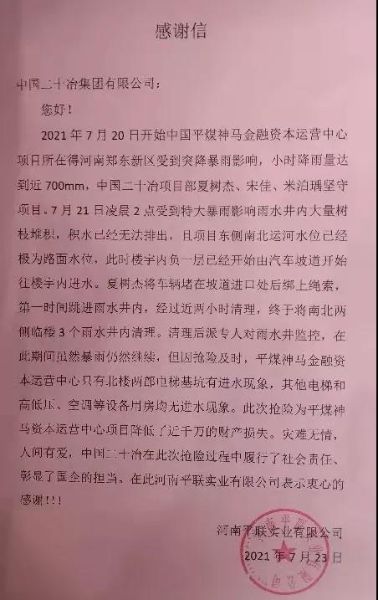 In late July, a sudden torrential rain hit Henan and serious waterlogging struck its capital city of Zhengzhou. In the face of torrential rain and flood disasters, the Project Management Personnel of Zhengzhou Pingmei Shenma Capital Operation Center of the EPC Company bravely conducted rescue work regardless of danger, dredged the rainwater wells against the wind and rain, ensured the safety of buildings and equipment, and retrieved hefty property losses for the Owner. They were praised by the Owner. On July 24, Henan Pinglian Industrial Co., Ltd. sent a letter of thanks to the Company.
