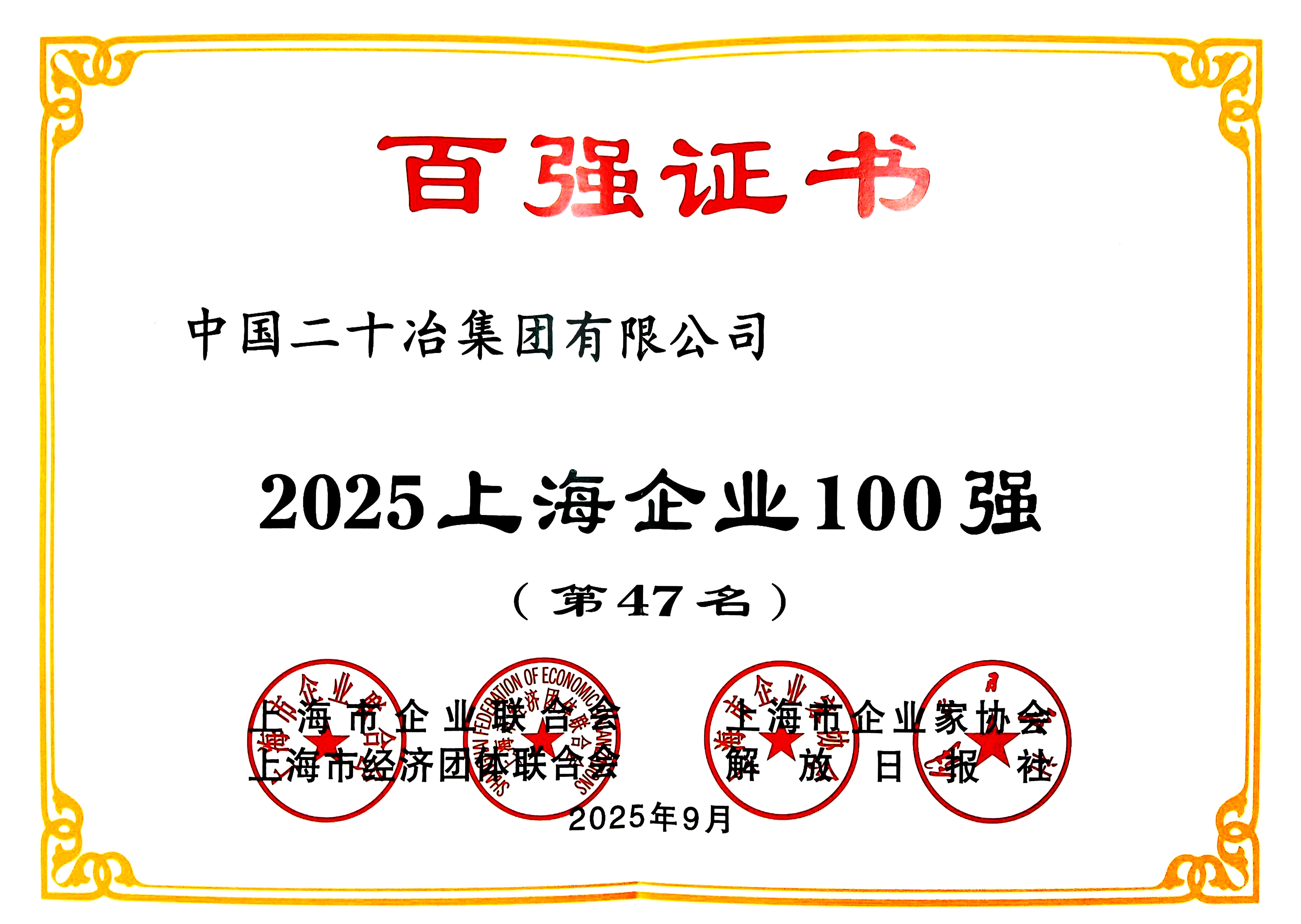 9月23日,上海发布百强企业榜单,中国二十冶在此次评选中荣获2025上海企业100强,第47名,这是中国二十冶连续七年上榜,彰显了公司在建筑业方面的经营实力。