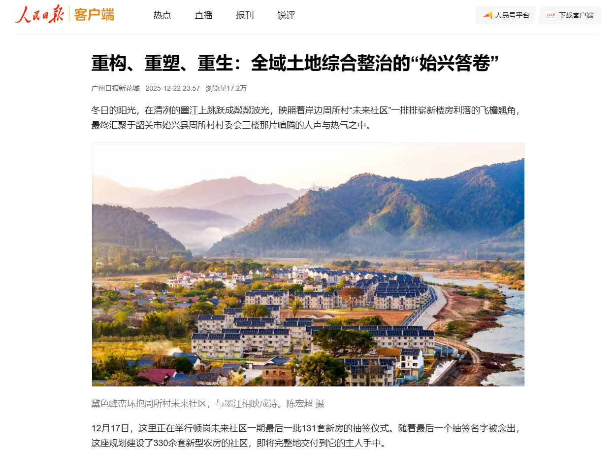 12月22日,《人民日报》客户端以《重构、重塑、重生:全域土地综合整治的“始兴答卷”》为题,对深圳二十冶承建的始兴县顿岗镇全域土地综合整治(乡村空间“三提三化”)项目进行了报道。