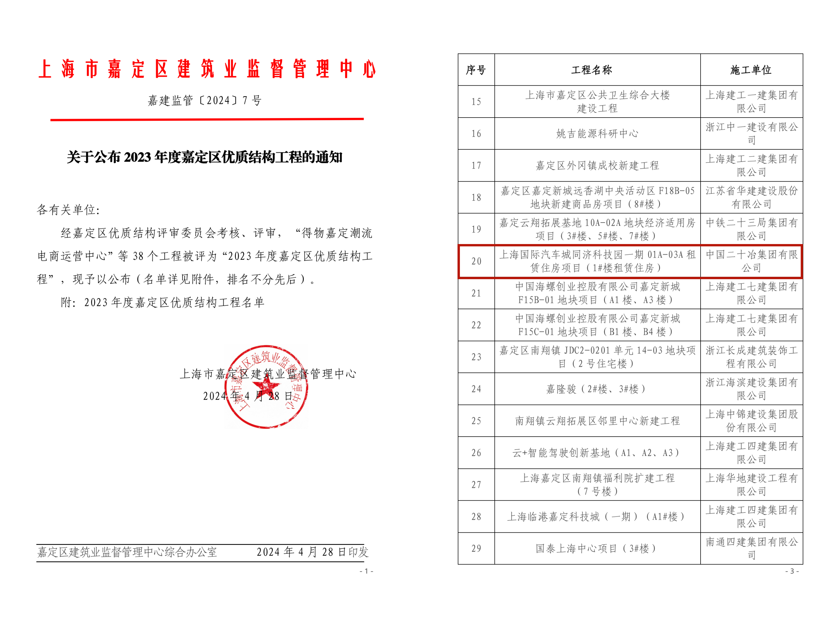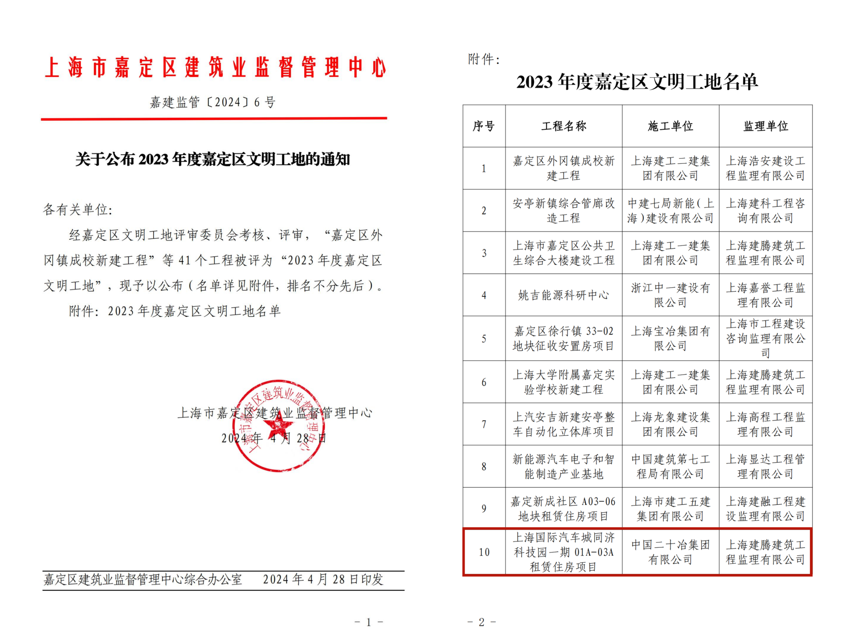 6月26日,从嘉定区建筑业监督管理中心获悉,技改公司承建的上海国际汽车城同济科技园一期01A-03A租赁住房(天骄公寓)项目荣获2023年度“嘉定区文明工地”及“嘉定区优质结构工程”荣誉。