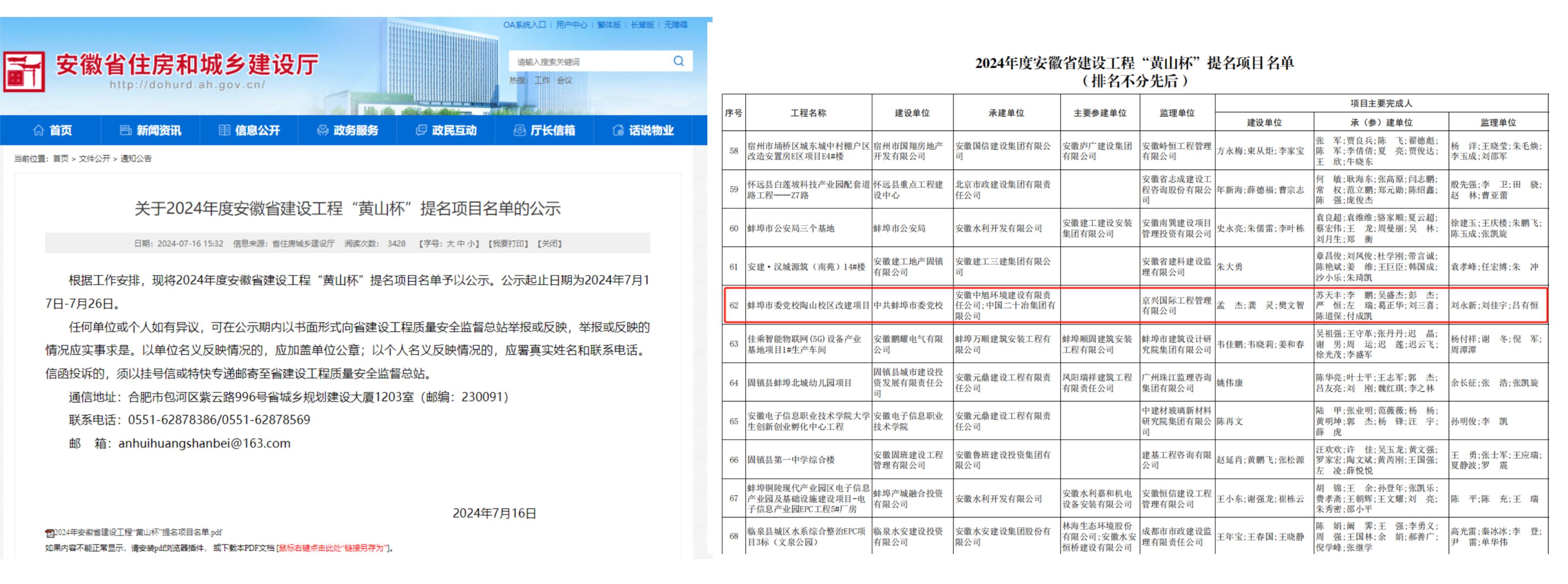 7月27日,安徽省住房和城乡建设厅发布了《关于2024年度安徽省建设工程“黄山杯”提名项目名单的公示》,经过严格的审查和评比,由安徽二十冶承建的蚌埠市委党校陶山校区改建项目光荣上榜。这一荣誉不仅是对该项目工程质量和设计水平的高度认可,也是对参与建设的所有团队成员辛勤努力的肯定。