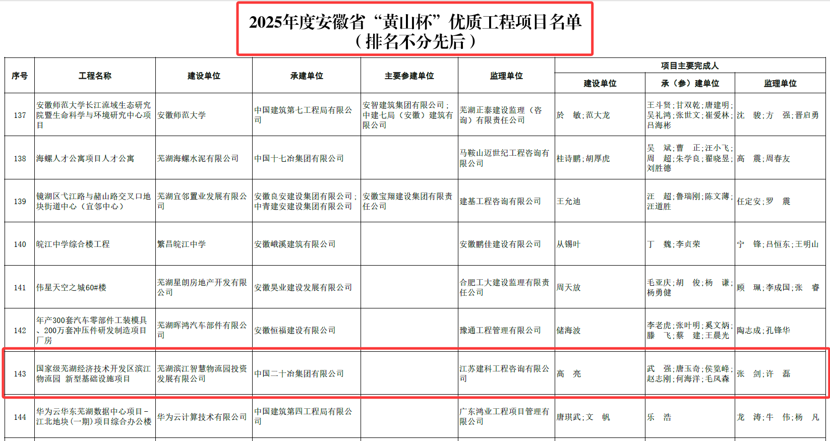 10月9日,湖北二十冶承建的芜湖经济技术开发区滨江物流园新型基础设施项目荣获安徽省2025年度“黄山杯”优质工程奖。