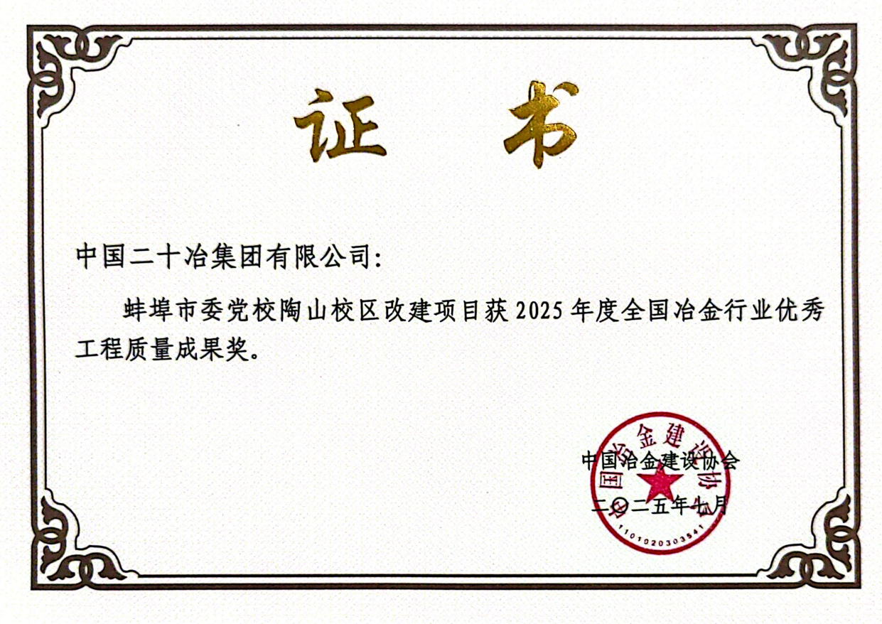 10月13日,安徽二十冶承建的蚌埠市委党校陶山校区改建项目,荣获2025年度全国冶金行业优秀工程质量成果奖。