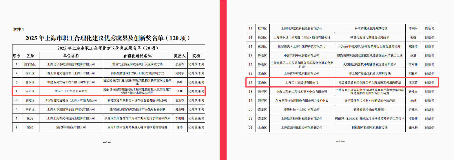 10月16日,上海市职工技术协会公布2025年职工合理化建议和先进操作法优秀成果相关决定,中国二十冶工会参与申报的两项成果斩获殊荣:冶金工业公司齐麟团队的“复杂设备基础钢筋混凝土精准建模算量及数字化施工管理关键技术研究与应用”获合理化建议优秀成果奖,上海二十冶华东公司宋文智团队的“高层建筑悬索柔性施工平台快速施工先进操作法”获先进操作法创新奖。