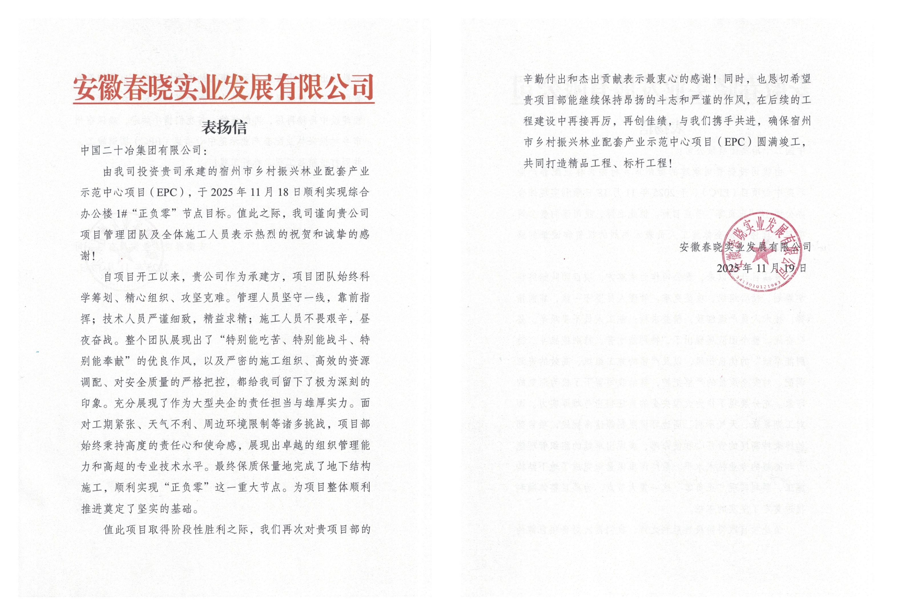 11月24日,安徽二十冶承建的宿州市乡村振兴林业配套产业示范中心项目(EPC)收到业主方安徽春晓实业发展有限公司发来的表扬信。