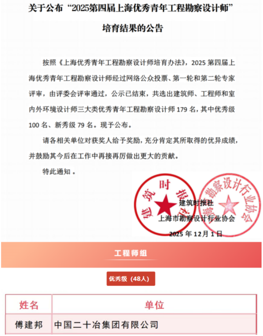 2025年12月,“2025第四届上海优秀青年工程勘察设计师”培育结果公布,设计院傅建邦光荣入选“优秀级”。