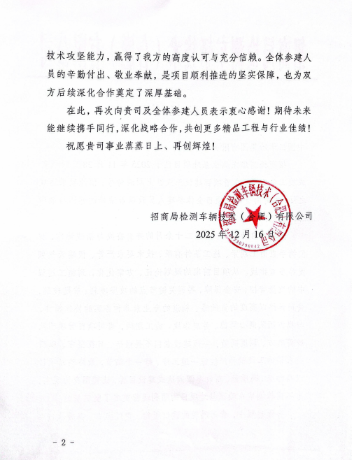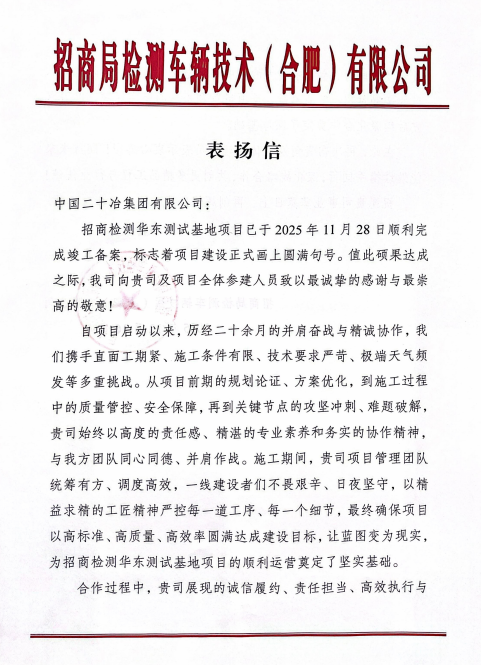 12月16日,广东二十冶合肥招商检测华东测试基地项目部收到业主方招商局检测车辆技术(合肥)有限公司发来的表扬信。