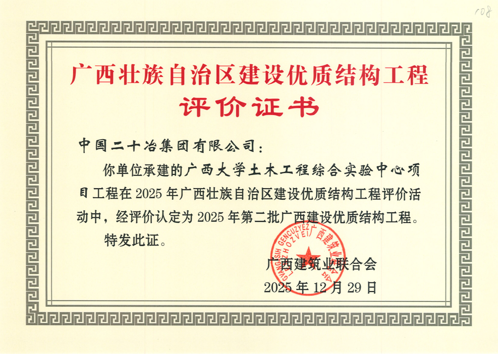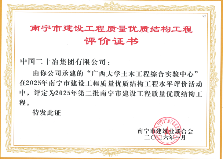 1月11日,上海二十冶广西大学土木工程综合实验中心项目成功获评“2025年南宁市建设工程质量优质结构工程”“2025年广西建设优质结构工程”。