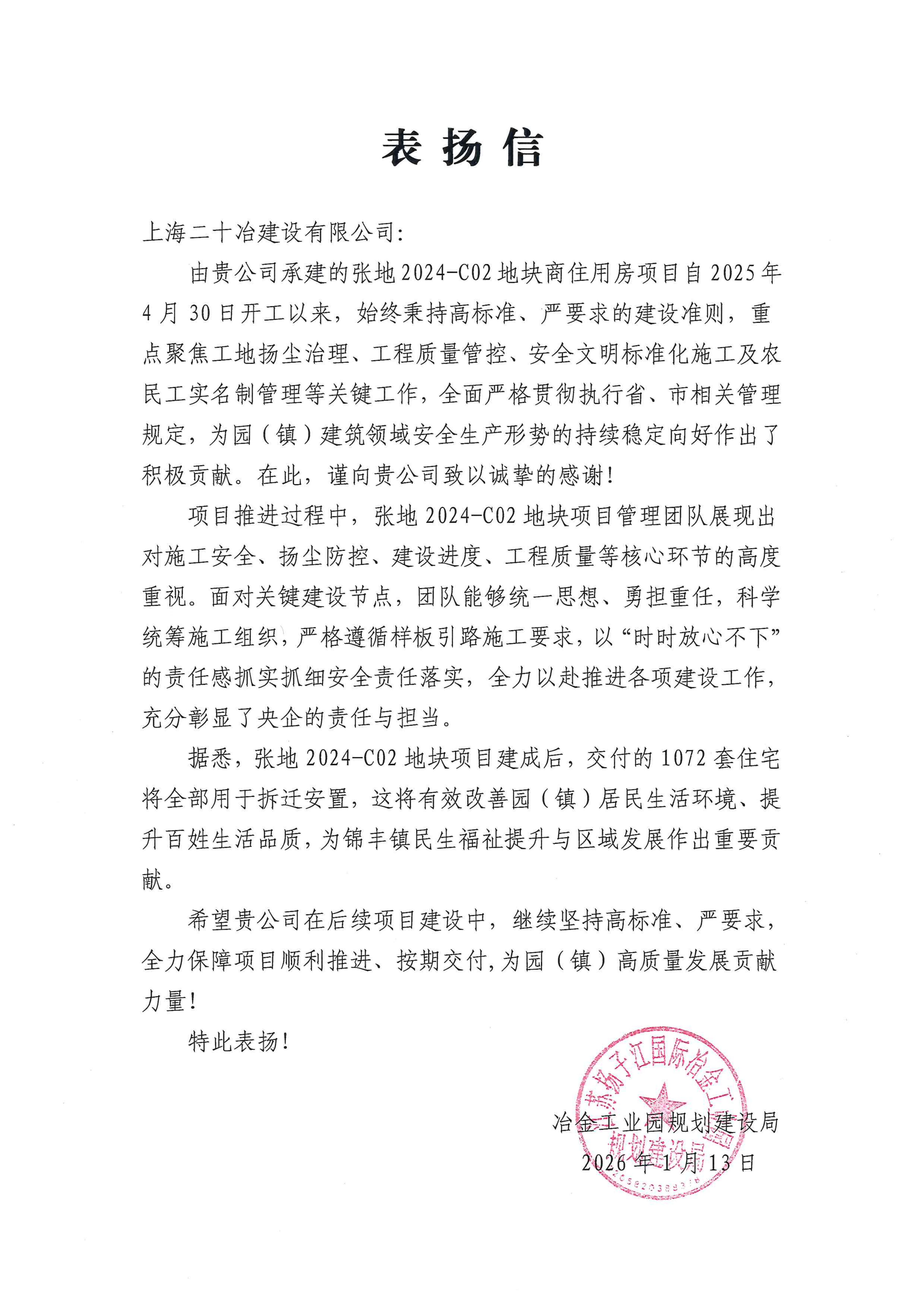 1月13日,上海二十冶张家港冶金工业园(锦丰镇)安置房商住地块联动开发项目收到张家港冶金工业园规划建设局发来的表扬信。