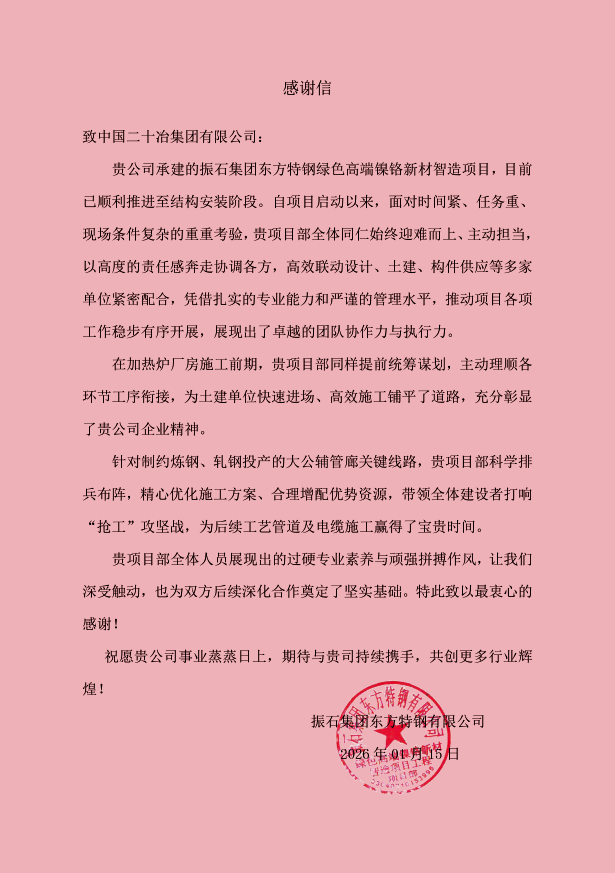 1月15日,由冶金工业公司承建的振石集团东方特钢绿色高端镍铬新材智造项目,收到来自业主单位振石集团东方特钢有限公司发来的感谢信。