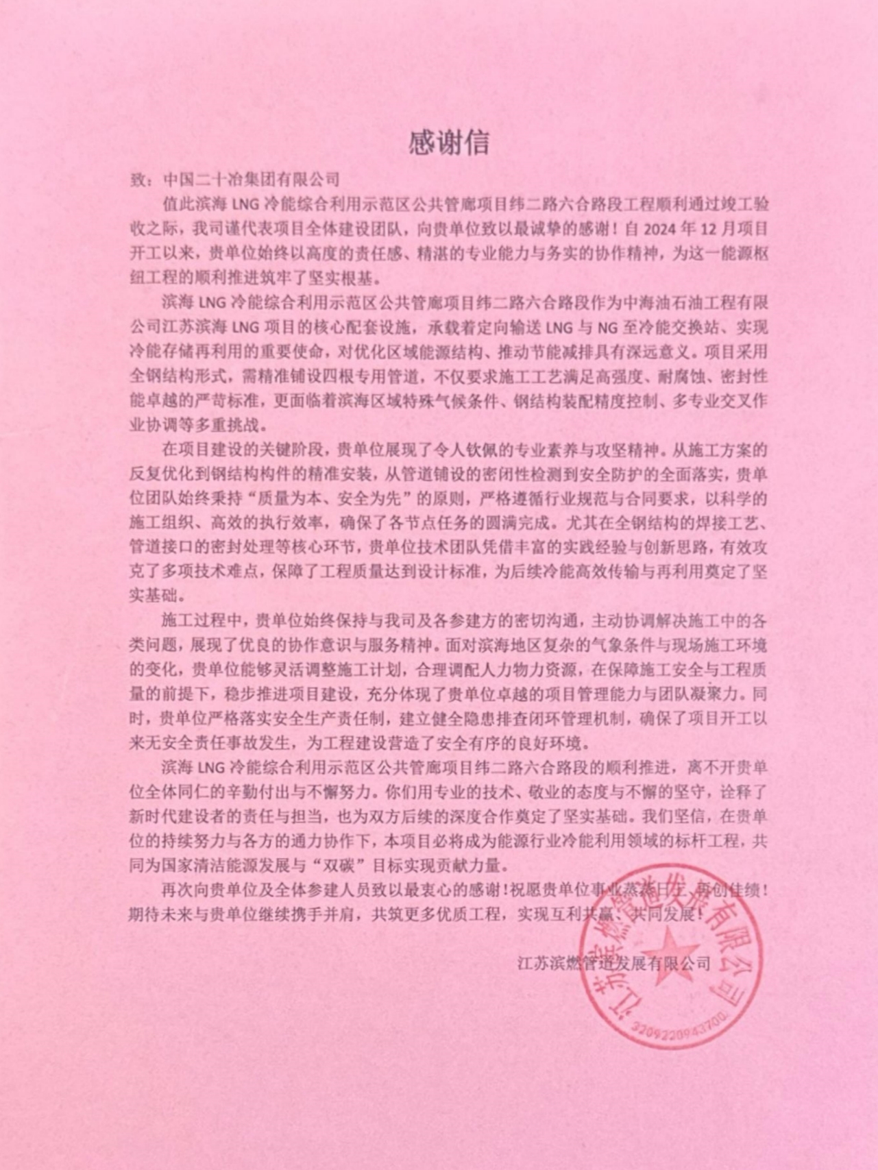 1月20日,由市政公司承建的滨海LNG 冷能综合利用示范区公共管廊项目纬二路六合路段工程,收到业主单位江苏滨燃管道发展有限公司发来的感谢信。信中对项目圆满通过竣工验收给予高度赞誉,向全体参建人员的专业匠心、责任担当与高效协作致以最诚挚的感谢。
