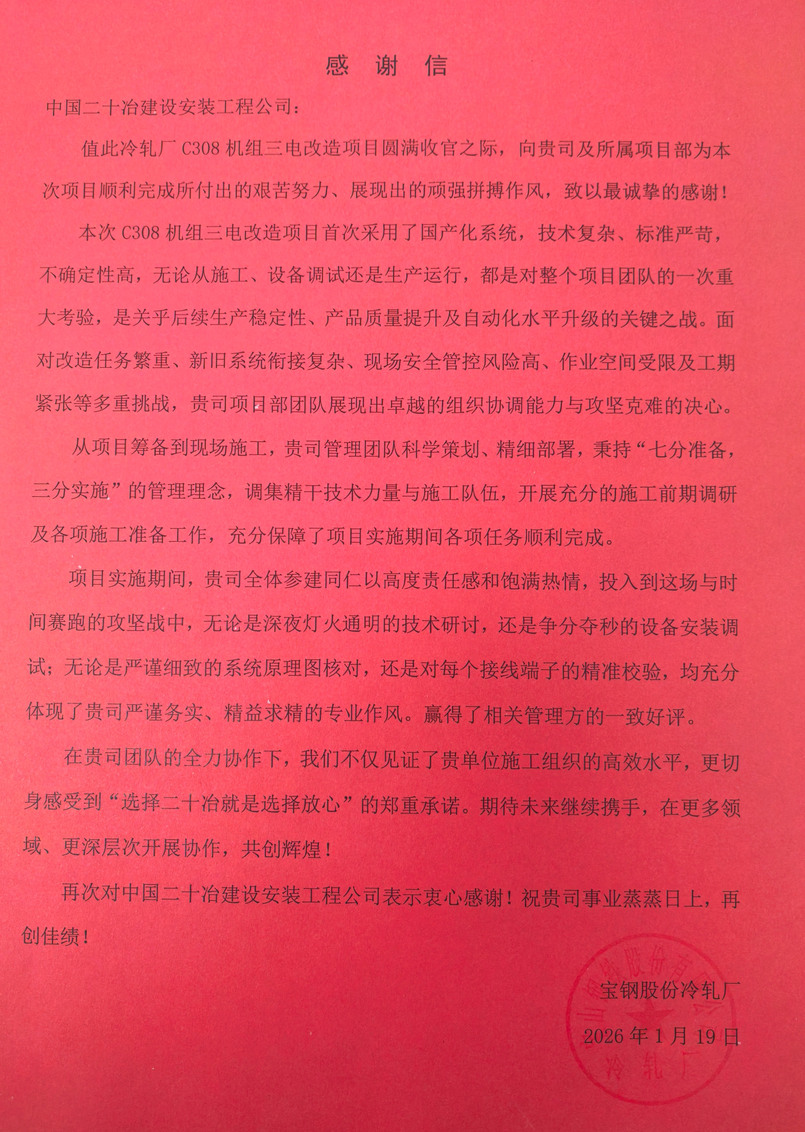 1月27日,宝钢股份冷轧厂副厂长刘德成一行到访建设安装公司,代表厂部递交感谢信。他高度肯定了中国二十冶建设者在C308机组三电改造项目中表现出的专业素养、攻坚精神与顽强作风,并对项目团队连续55个昼夜的辛勤付出表示衷心感谢。