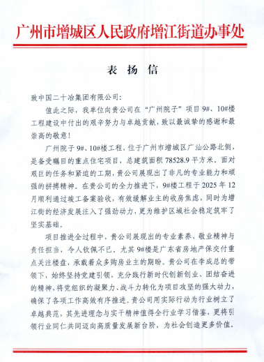 1月28日,广州市增城区人民政府增江街道办事处(县政府)发来表扬信,对广东二十冶广州院子G9号、G10号两栋高层项目在工程建设过程中付出的艰辛努力与卓越贡献给予高度赞誉。