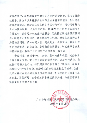 信中表示,广州院子高层G9号楼是广东省房地产保交付重点关注楼盘,承载着众多购房业主的期盼,在项目推进过程中,广州院子项目管理团队以多种形式主动与业主保持密切联系,及时通报项目进展情况,耐心回应业主的各类关切与诉求,用心用情解决业主的实际问题。在项目管理团队的不懈努力下,G9号楼工程于2025年12月顺利通过竣工备案验收,有效缓解购房业主的收房焦虑,同时为增江街的经济发展注入了强劲动力,更为维护区域社会稳定筑牢了坚实基础。