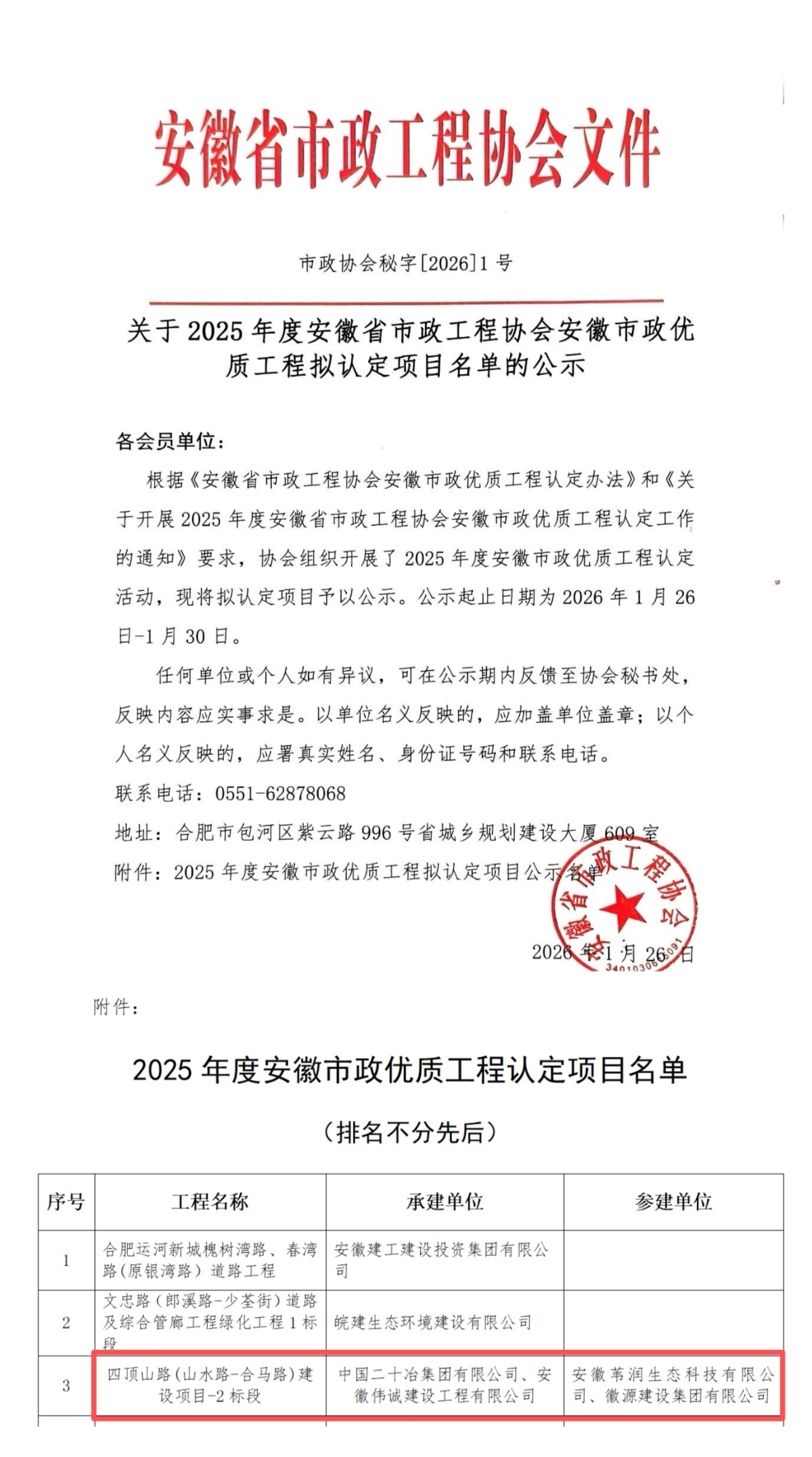 2月2日,从安徽省市政工程协会传来喜讯,安徽二十冶承建的合肥市肥东县四顶山路(瑶岗路--林霏路)项目获评“2025年度安徽市政优质工程”。