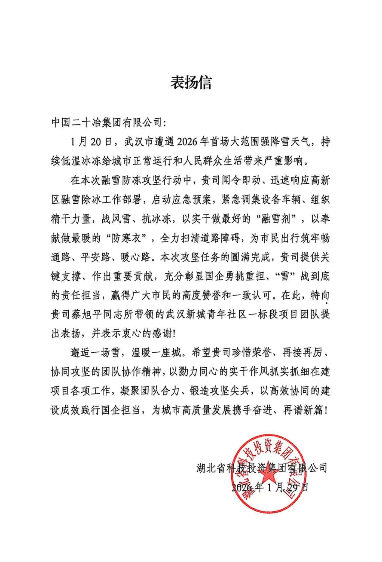 2月2日,湖北二十冶武汉新城青年社区项目收到来自湖北省科技投资集团有限公司的“表扬信”。在武汉市遭遇2026年首场降雪、交通面临严峻考验的关键时刻,项目积极投身融雪防冻攻坚行动,迅速响应和高效处置得到了业主公司的高度认可,信中特别表扬了项目团队在应急保障中的责任担当与突出贡献。