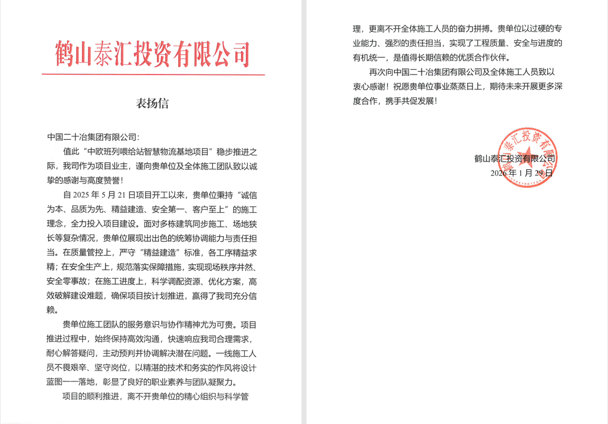 1月29日,由深圳二十冶承建的中欧班列喂给站智慧物流基地项目收到了业主单位鹤山泰汇投资有限公司发来的表扬信。这封满载肯定的信件,是对项目团队专业能力的高度认可。