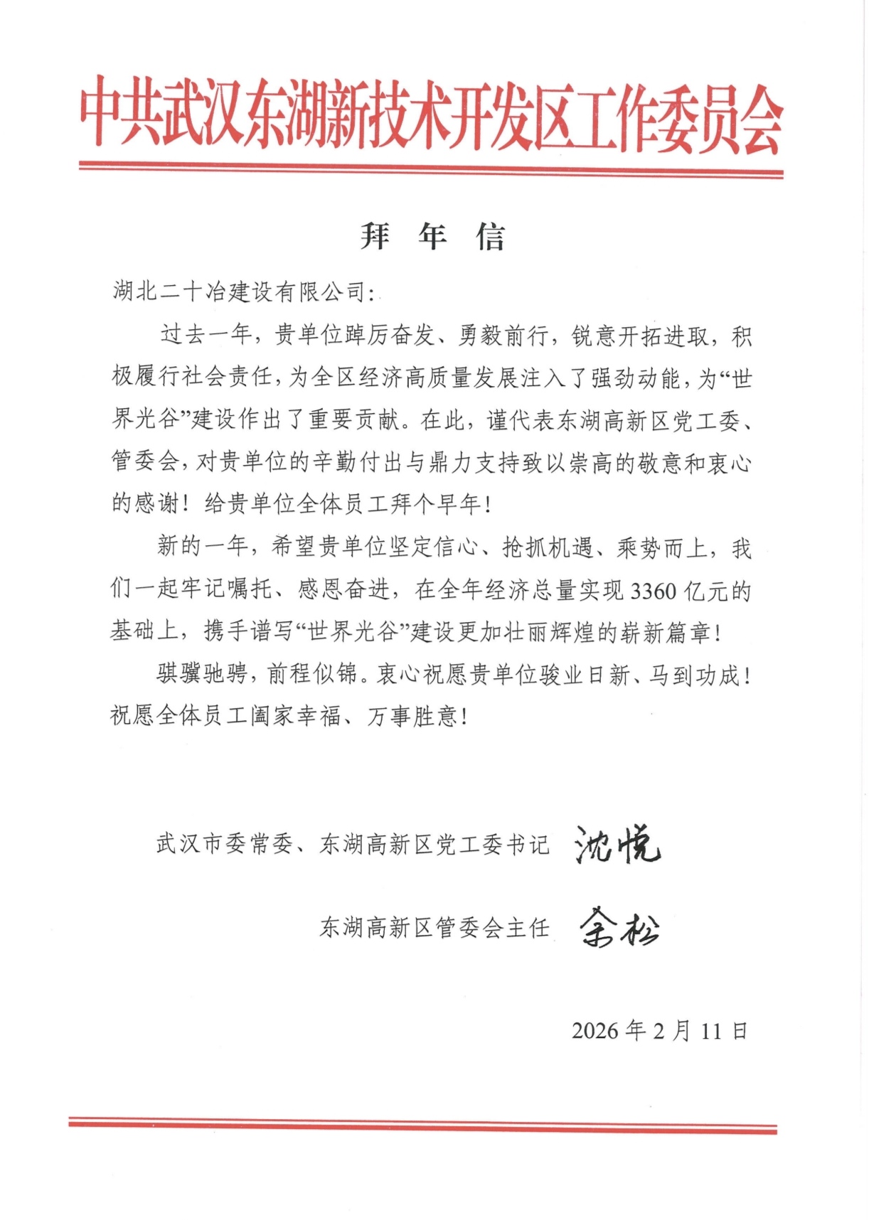 信中指出,过去一年,中国二十冶踔厉奋发、勇毅前行,锐意开拓进取,积极履行社会责任,为全区经济高质量发展注入了强劲动能,为“世界光谷”建设作出了重要贡献。在此,谨代表东湖高新区党工委、管委会,对贵单位的辛勤付出与鼎力支持致以崇高的敬意和衷心的感谢!给贵单位全体员工拜个早年!