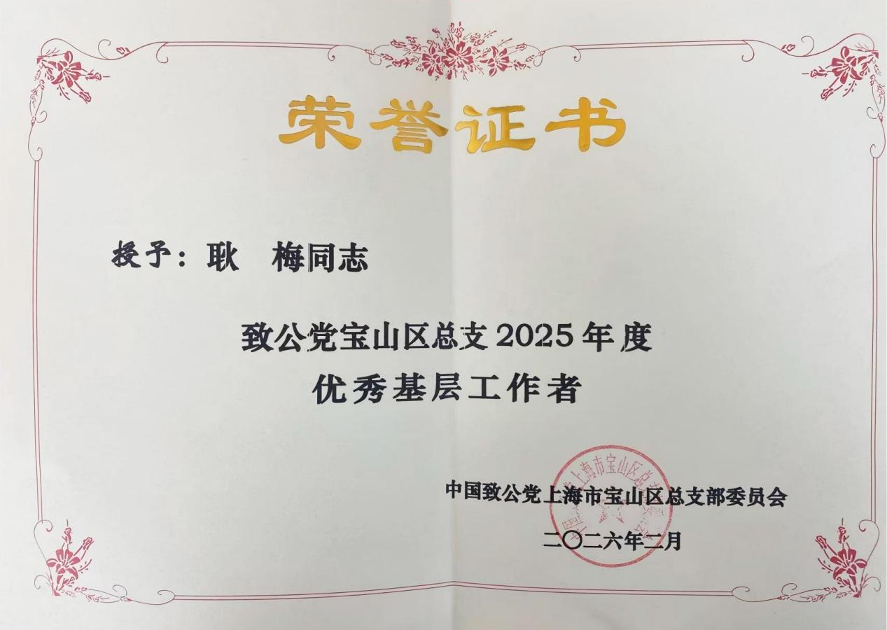 2月10日,设计院设备所所长耿梅同志荣获致公党宝山区总支“2025年度优秀基层工作者”称号。这一荣誉不仅是对她个人积极履职的高度肯定,更是设计院长期重视、扎实推进统战工作,引导和支持党外知识分子将专业优势转化为服务企业发展、贡献区域建设生动实践的成果缩影。