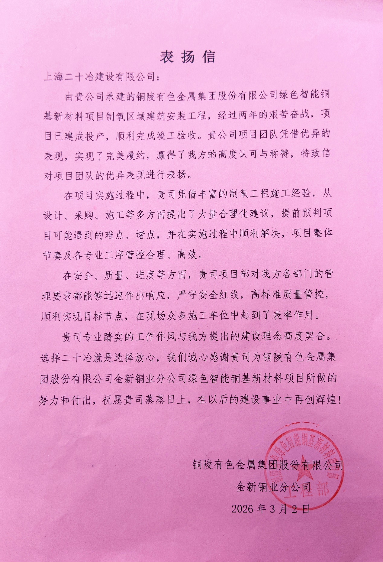 3月5日,上海二十冶承建的铜陵有色绿色智能铜基新材料项目制氧工程收到业主的表扬信。