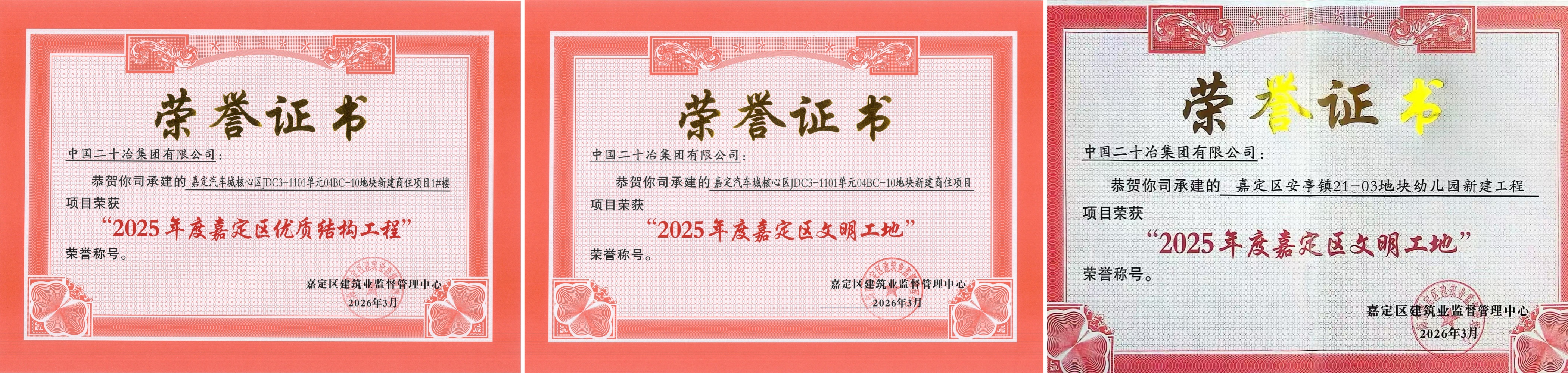 3月20日,建设安装公司收到上海市嘉定区建筑业监督管理中心颁发的荣誉证书。其中,嘉定汽车城核心区JDC3-1101单元04BC-10地块商办项目荣获2025年度嘉定区“优质结构工程奖”与“文明工地奖”两项殊荣,安亭镇21-03地块幼儿园项目荣获2025年度嘉定区“文明工地奖”。