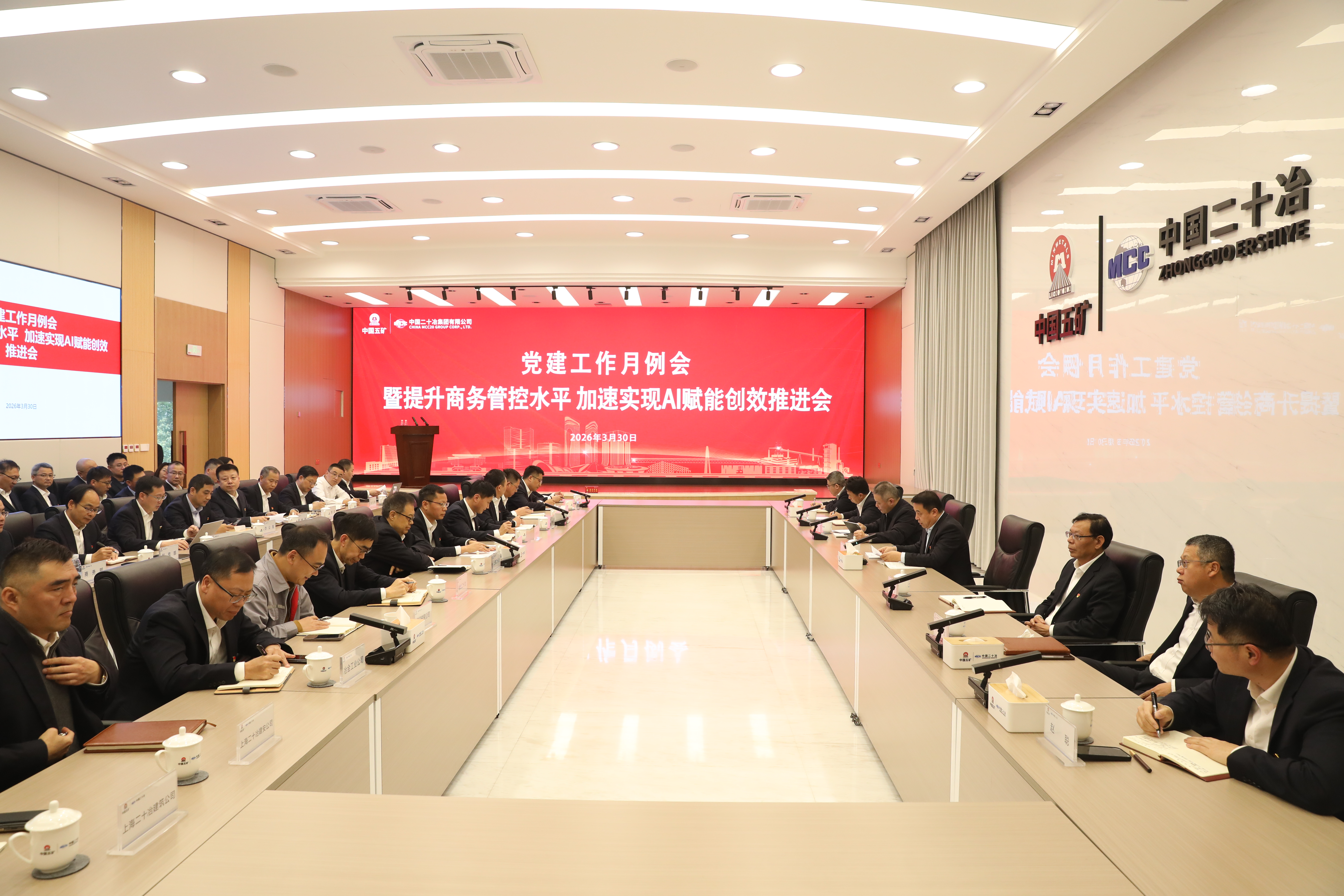 3月30日,中国二十冶召开党建工作月例会暨提升商务管控水平加速实现AI赋能创效推进会,深入学习领会习近平总书记关于树立和践行正确政绩观的重要论述,传达学习集团公司党建工作领导小组会会议精神,集团公司党组书记、董事长陈得信调研中国二十冶暨树立和践行正确政绩观学习教育征求意见座谈会提出的殷切希望与工作要求;部署学习教育重点工作,推进清廉项目建设;以党建引领,提升商务管控水平、加速实现AI赋能创效为主题,交流工作体会。党委书记、董事长徐立,党委副书记、总经理谭兴山出席会议并讲话,党委副书记夏士龙,纪委书记何光太结合分管领域作工作部署。
